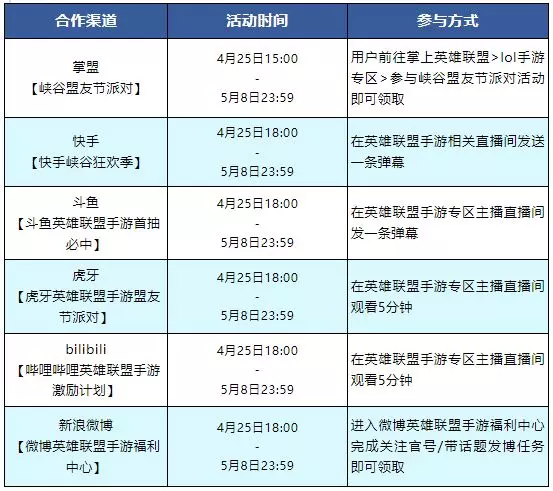 4月25日起各个合作渠道平台活动将会陆续上线,召唤师可前往下述平台完成对应任务获得更多“信风之灵”。