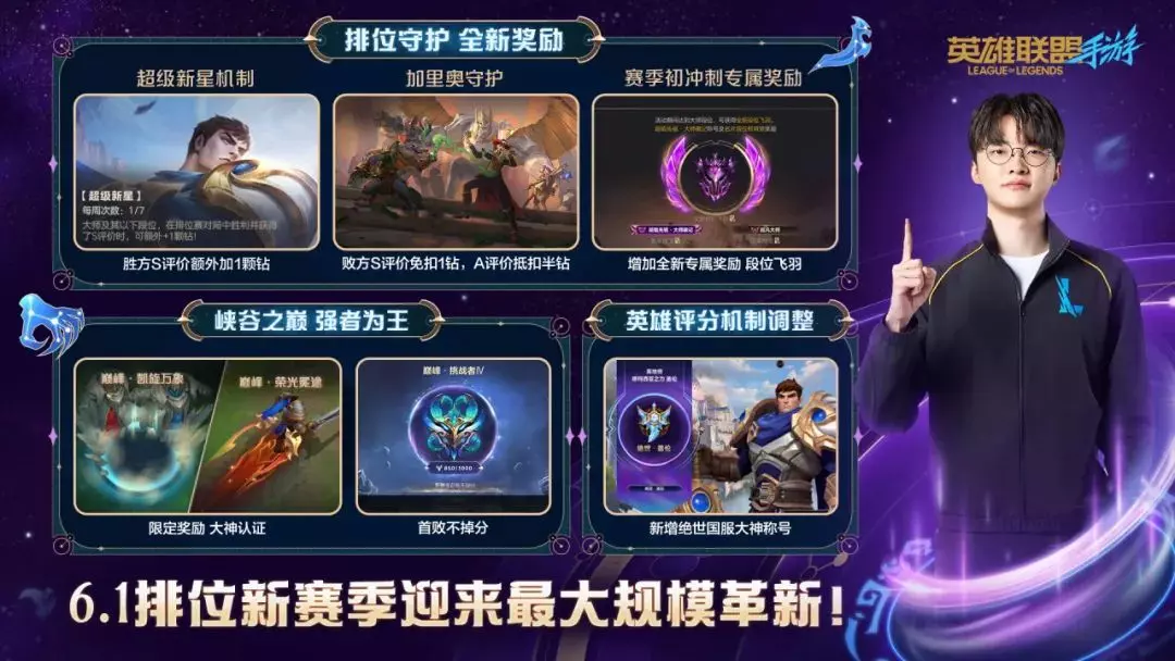 6.1排位新赛季大革新,福利拉满!胜方有超级新星机制,大师及以下段位每周7次机会,拿S评价额外加钻;败方别慌,加里奥守护,S评价免扣1钻、A评价抵扣半钻。