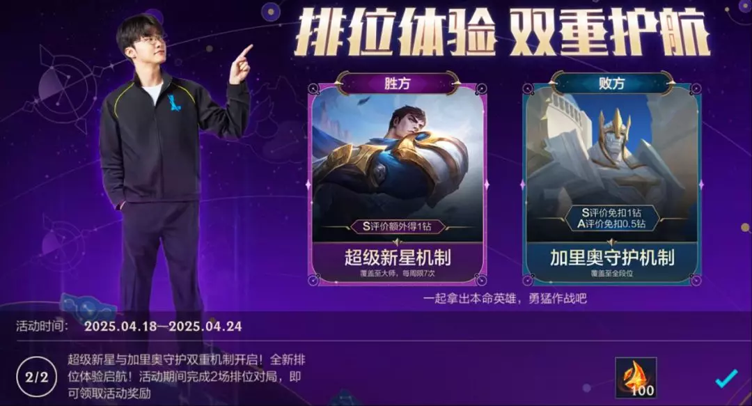 “超级新星机制”与“加里奥守护机制”开启,全新排位体验双重护航!即日起,截止至4月24日23:59,召唤师完成2场排位赛对局,即可领取龙魂水晶*100奖励~
