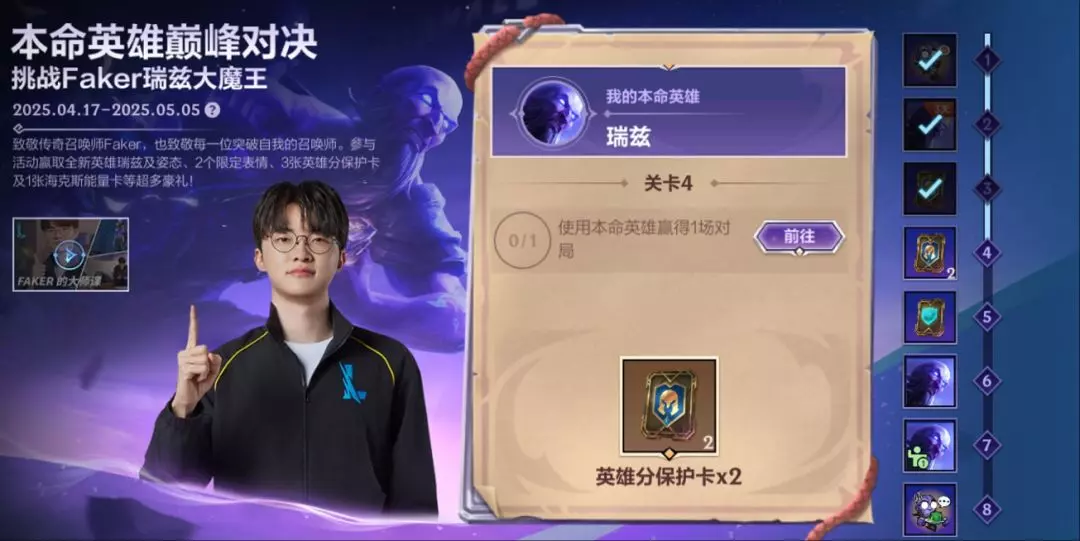 致敬传奇召唤师Faker,也致敬每一位突破自我的召唤师!截止至5月5日,召唤师参与活动即可赢取新英雄符文法师 瑞兹、姿态-浮卷、限定局内表情-西兰花?与限定局内表情-嘘!魔王来了等超多好礼~