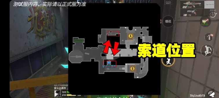 在九龙城寨战术地图中,红色方框所示位置有一个可以来回往返的索道。从战术地图上看,这两处索道位置比较利好潜伏者。潜伏者可以利用该索道在进攻A点和B点的线路上快速转点。