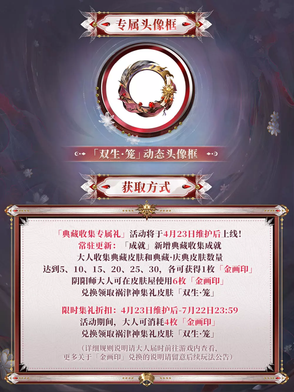 △ 祸津神集礼皮肤「双生·笼」将于4月23日维护后上线,可通过「典藏收集专属礼」活动获取。