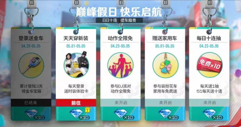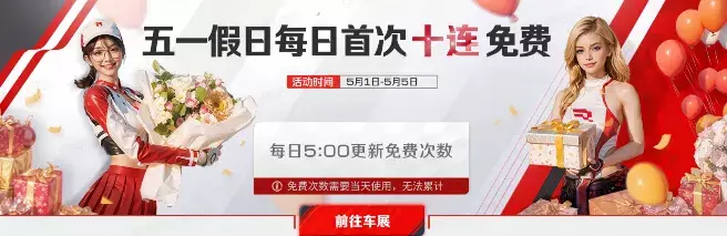 5月1日-5月5日,巅峰车展每日免费赠送十连抽,共计50抽;