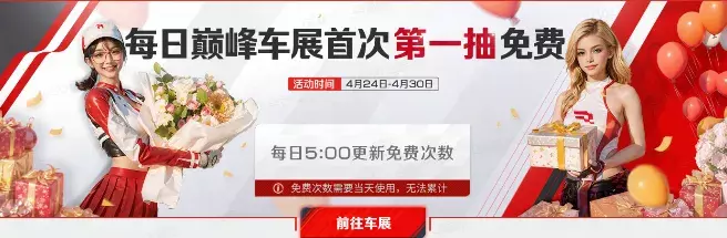 4月24日维护后-4月30日,巅峰车展每日免费赠送一抽,共计7抽;