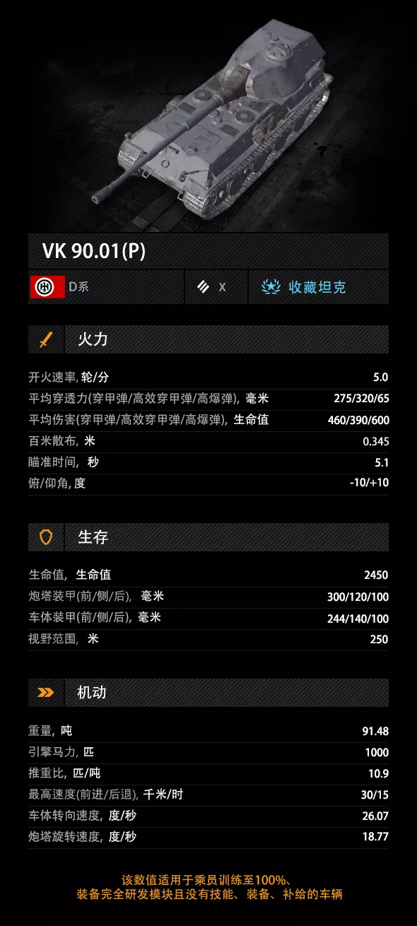 VK 90.01 (P)安装的128毫米主炮为其提供了优秀的百米精度,战斗稳定机制更是让瞄准如虎添翼。460/390/600的均伤属于标准水平,但297/336/70的穿深很有优势。