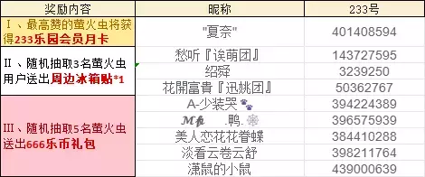 Ⅰ、最高赞的萤火虫将获得233乐园会员月卡