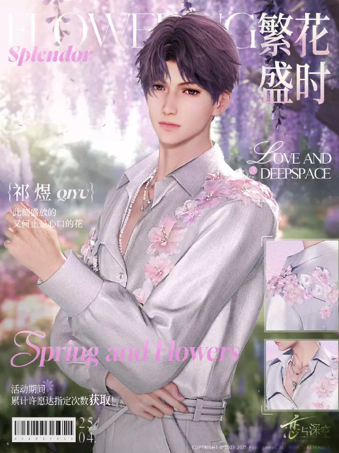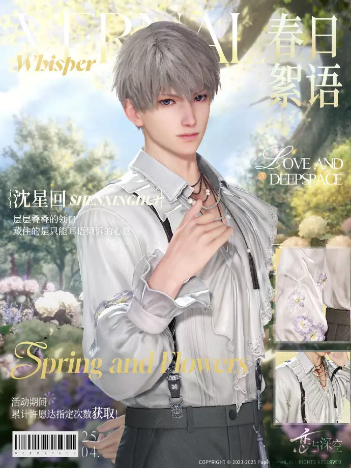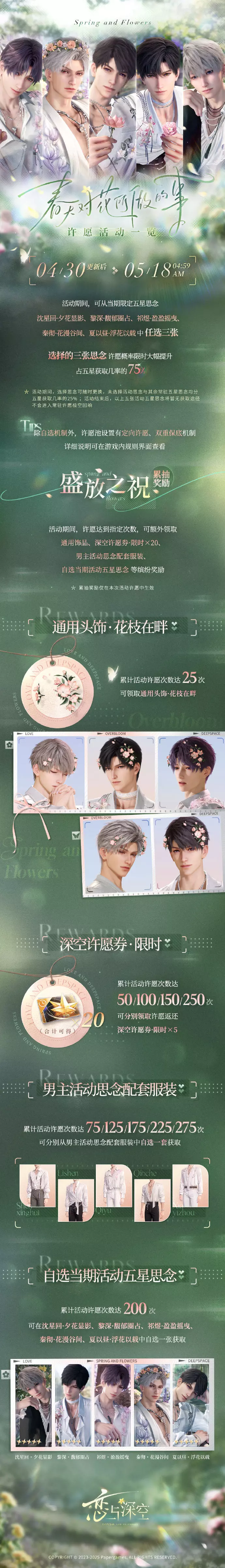 累计活动许愿达200次时,可在「沈星回·夕花显影」、「黎深·馥郁圈占」、「祁煜·盈盈摇曳」、「秦彻·花漫谷间」、「夏以昼·浮花以载」中自选一张获取。