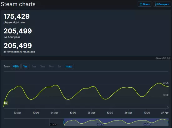 根据Steamdb数据显示,游戏自发售以来,Steam最高在线人数为205499人。