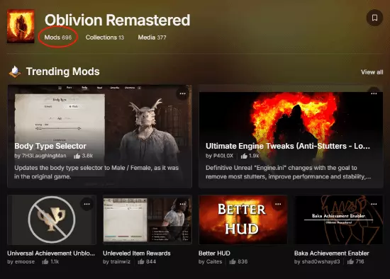 《上古卷轴4:湮灭重制版》发售已经过去5天了,玩家社区人气火热异常,截至目前,N网已有近700款(696)款MOD。