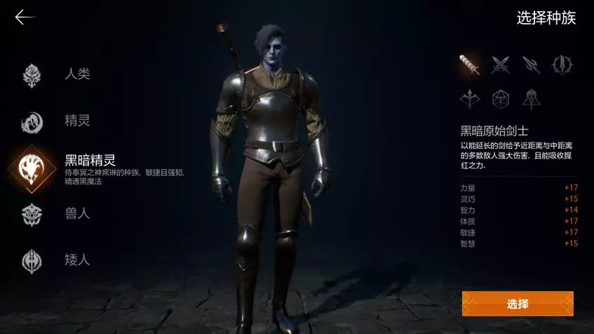 人类、精灵、黑暗精灵、兽人和矮人中