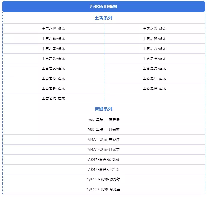 在五一小长假期间,折扣商城内进一步将福利加码,上架了众多的只能限时购买的万化道具,其中不仅涵盖了众多王者武器的虚无光效,也推出了一系列普通武器的珍藏光效,以下即为整体概览。