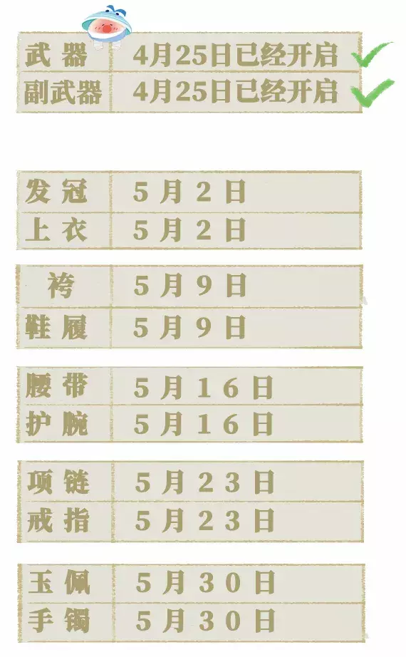 为了减轻少侠们短时间内培养大量数值的压力,不同装备部位的淬锋第二套方案将在一个月内逐步开启!敬请少侠收下这张逐步开放时间表: