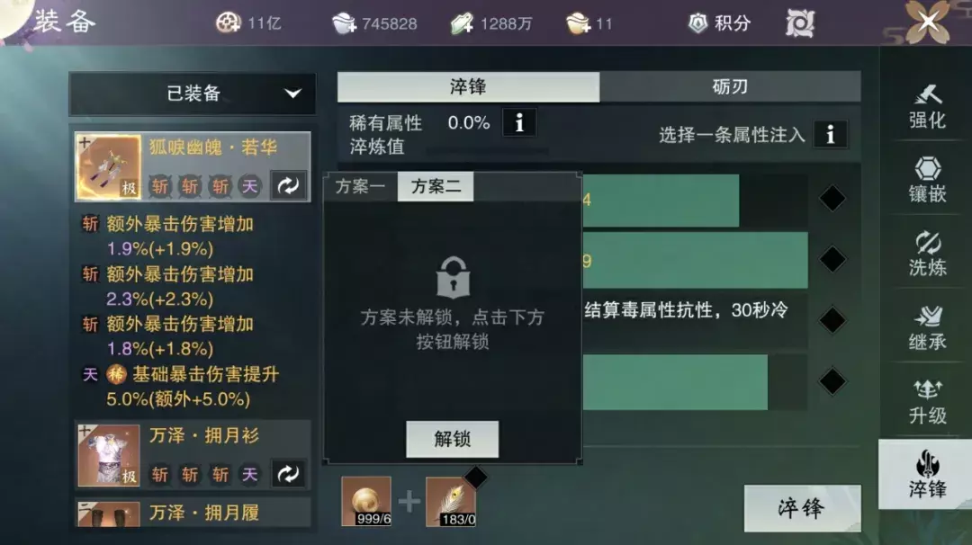 在装备页面,少侠可以点开淬锋栏目,选择想要切换的装备,即可切换淬锋一套和二套方案,点击解锁按钮即可解锁第二套淬锋啦!