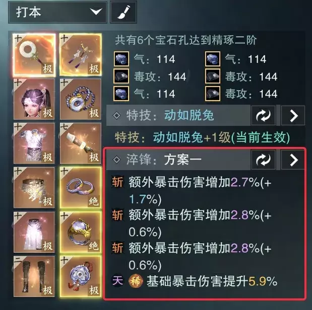 数值方案功能中,也增加了淬锋的方案选择,少侠可以在数值方案界面左侧找到“淬锋”模块进行设置哦。