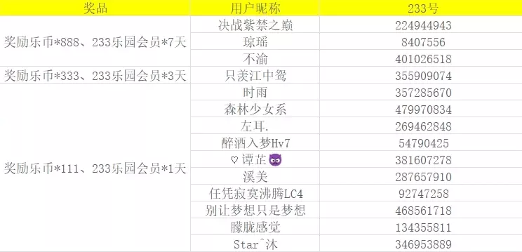 三等奖(5名):奖励乐币*333/位、233乐园会员*3天/位