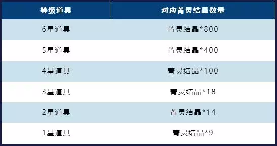 在「时空探索装置」中获得的重复道具,将根据下列规则折算为不同数量的「菁灵结晶」。
