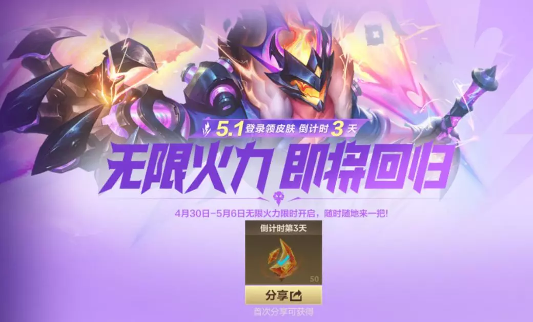 无限火力,即将回归!4月30日-5月6日期间,无限火力娱乐模式限时开启,德莱联盟、进击的小兵等超多彩蛋一同登场,随时随地都能来一场疯狂激战~距离福利开启仅剩3天,是时候喊上好友,一起畅享欢乐战斗,加入这场狂欢!