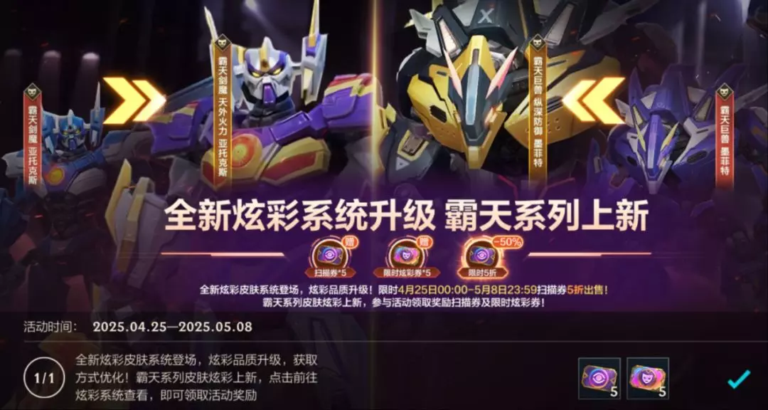 此外,霸天系列皮肤已炫彩上新,截止至5月8日23:59,召唤师参与活动前往炫彩系统查看,即可领取扫描券*5、限时炫彩券*5奖励!