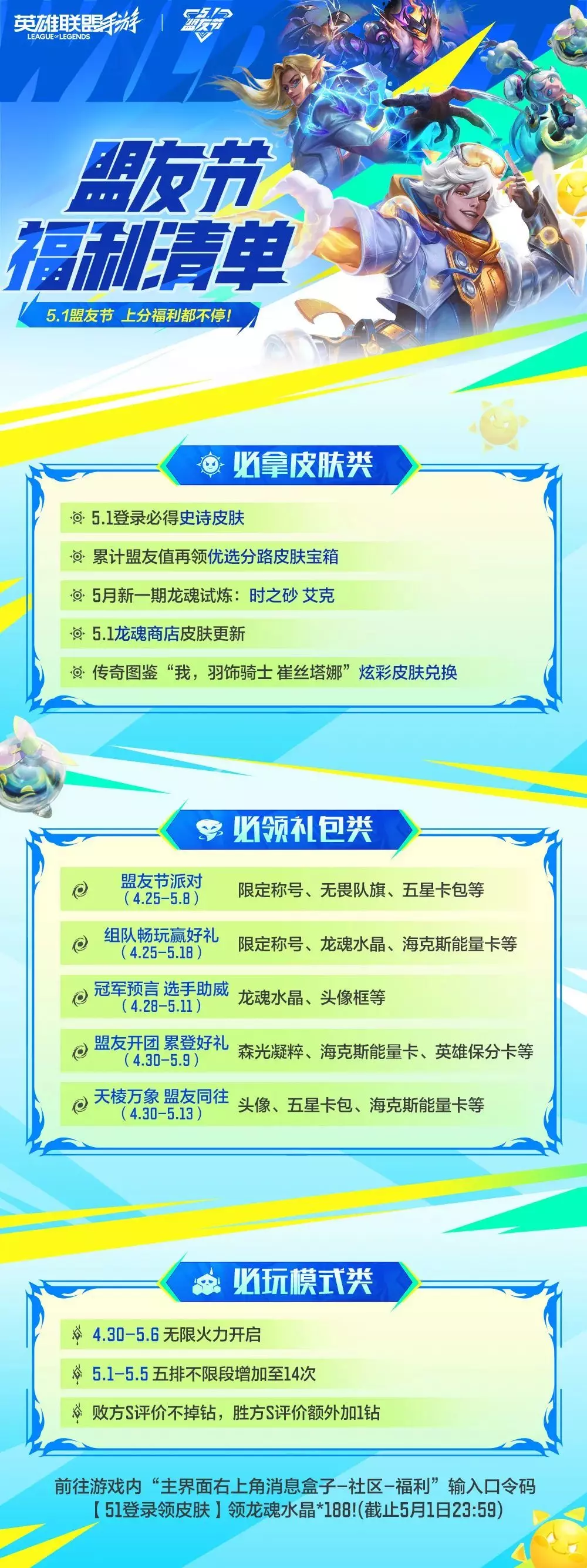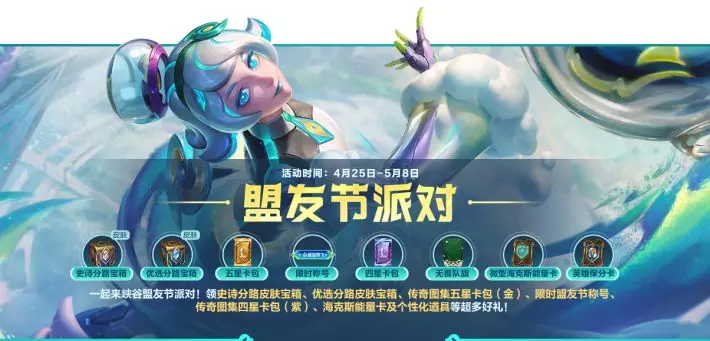 盟友节派对火热进行中~召唤师们记得【5.1登录领史诗皮肤】!完成任务积累盟友值进度,再拿【优选分路皮肤宝箱】!