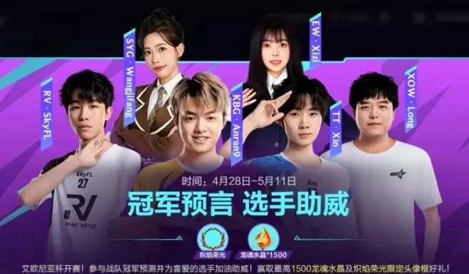 艾欧尼亚杯开赛!即日起,截止至5月11日,召唤师参与战队冠军预测并为喜爱的选手加油助威,即可领取最高龙魂水晶*1500及限定头像框-炽焰荣光好礼~