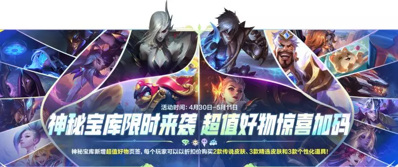 神秘宝库,好物加码!本次神秘宝库开启时间持续12天~4月30日11:00-5月11日23:59活动期间,神秘宝库新增“超值好物”页签,召唤师可以以折扣价购买2款传说皮肤,3款精选皮肤和3款个性化道具~