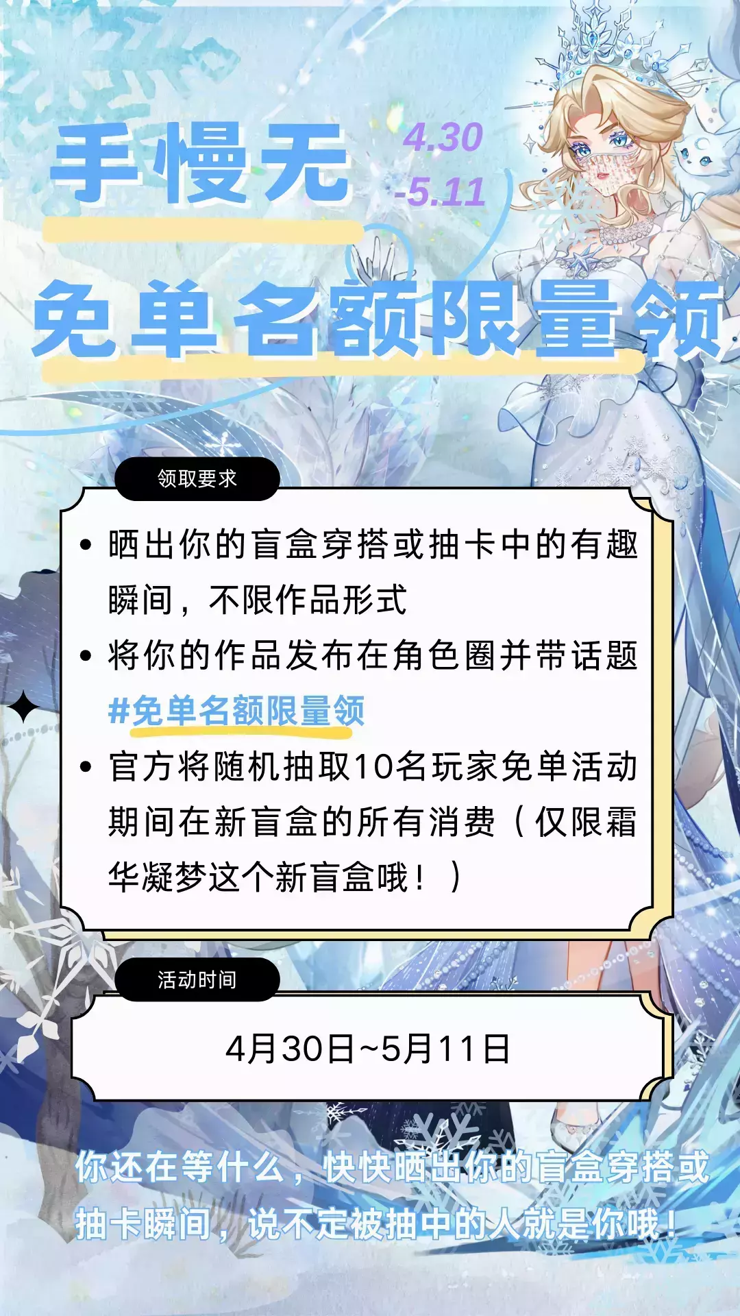 ⭐官方将随机抽取10名玩家免单活动期间在新盲盒的所有消费(仅限霜华凝梦这个新盲盒哦!)