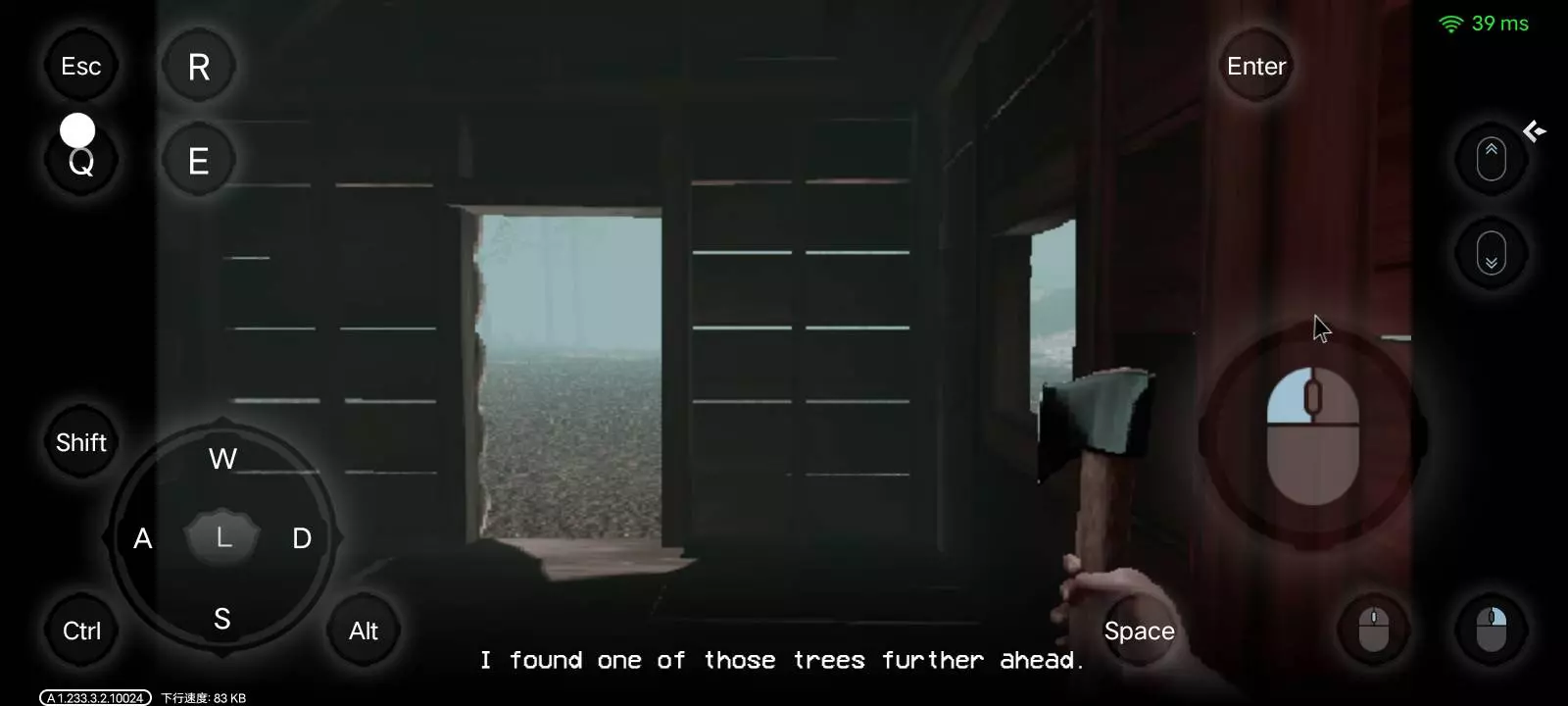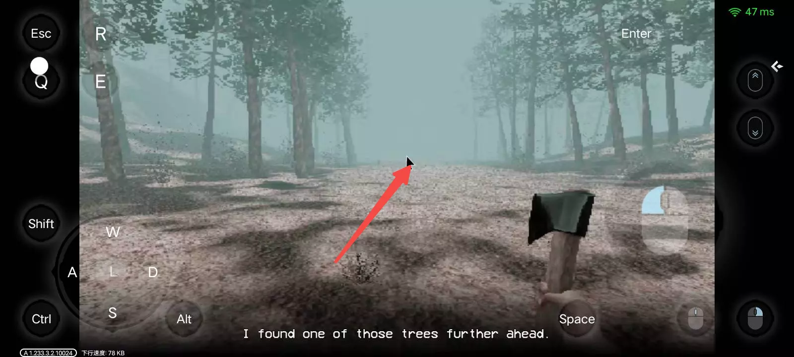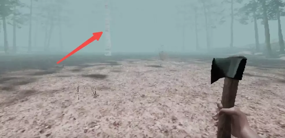3.从小屋出门之后往前一直直走,如下图所示,可以看到一颗与其他树不一样的血皮树(这就是我们第一天需要砍的树)