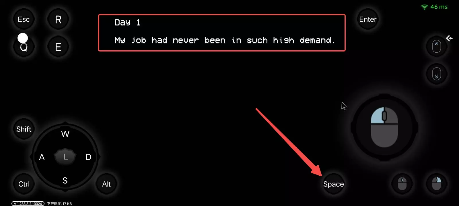 2.开始游戏后会出现游戏文本内容,此时我们可以点击“space”按钮往下看文本(之后遇到文本都可以这样操作),如下图所示,我们已经可以开始操作角色