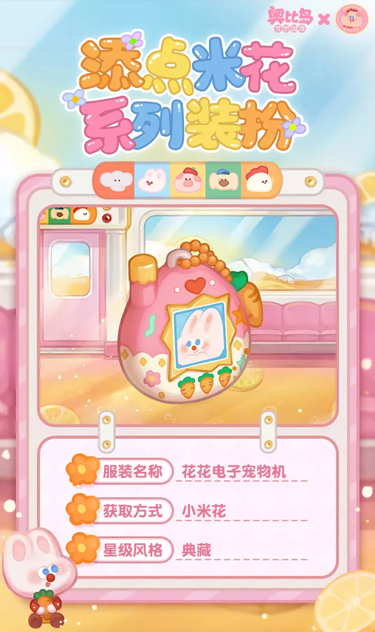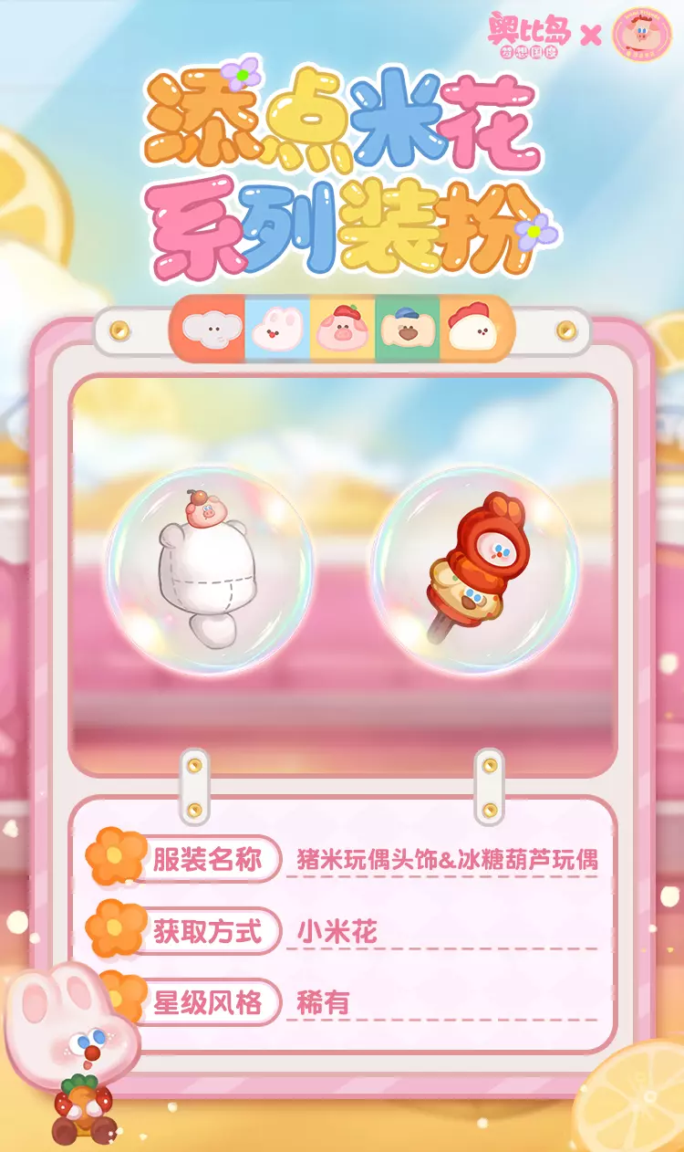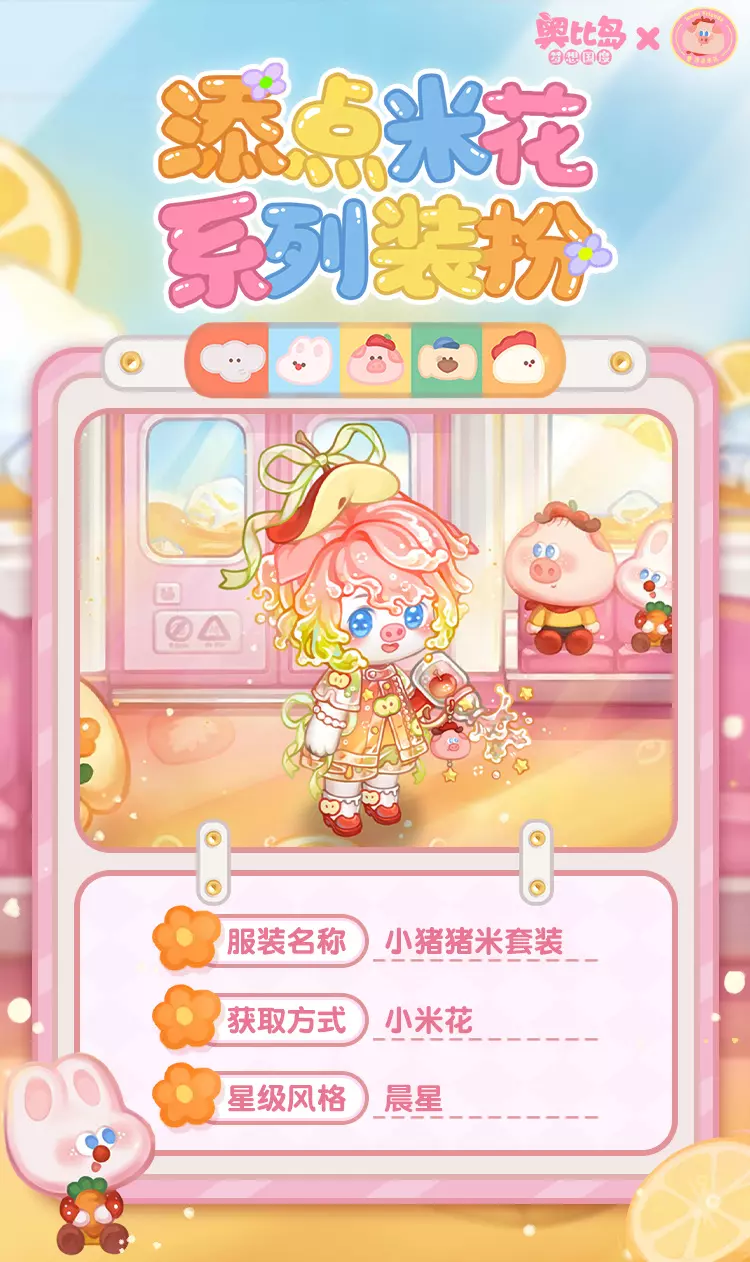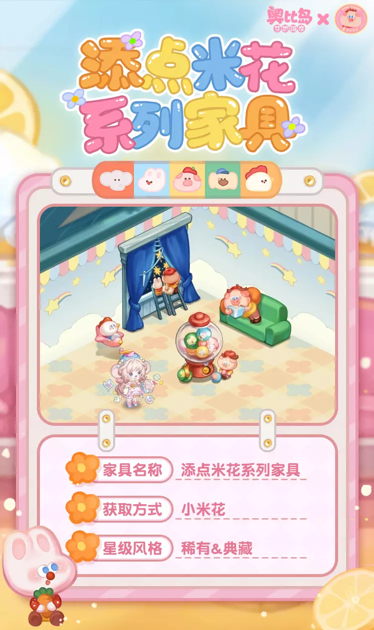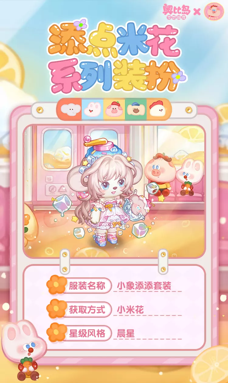 「添点米花」联动系列装扮上新!收集米花照片,可领取限定装扮「小猪猪米套装」「小象添添套装」、背景卡「猪米果汁列车」、聊天气泡框「猪米的幸福」、座椅「猪米飞毯」、称号「跟着猪米去旅游」、限定家具「猪米阅读沙发」等诸多奖励!活动期间,前往奥柏百货还可获取限定装扮「猪米气泡行李箱」和「小象添添围裙」哦~