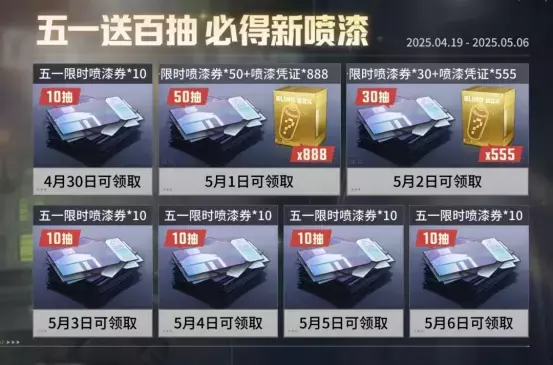 五一送百抽活动已开启!即日起,整整一周,百抽限时喷漆券+万份喷漆凭证积分上线签到即可领取,全新传说款限定喷漆-赤红棱镜免费送!这次你一定要实现喷漆自由!