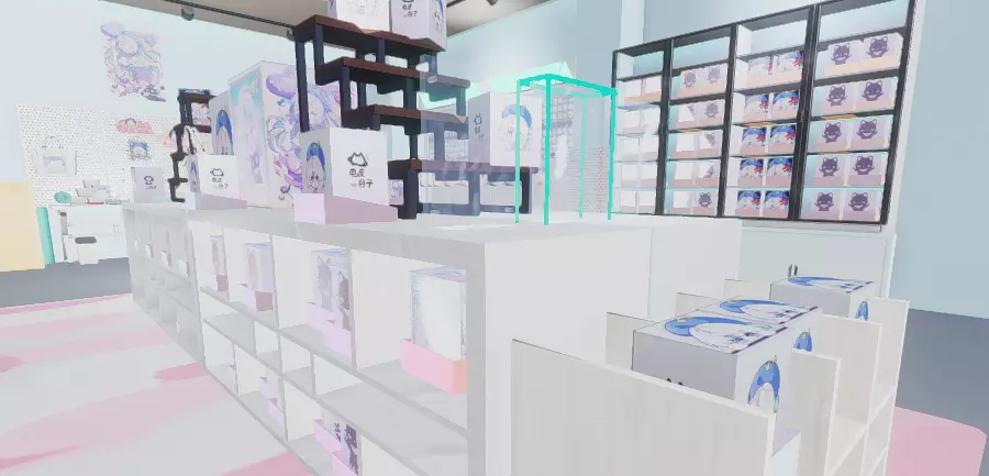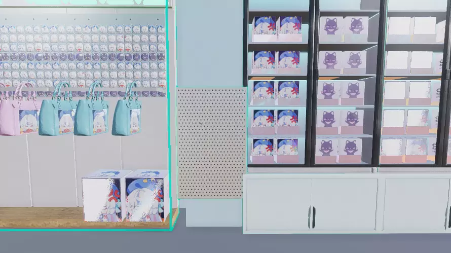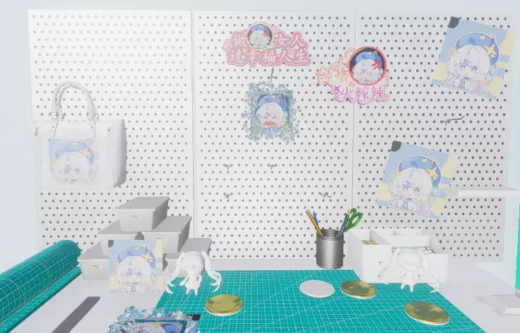 最后可以回到场景内在展示区域上架自己做的谷子! 分别在:左右两个洞洞板(明信片)、柜台(立牌)、正面洞洞板(吧唧)