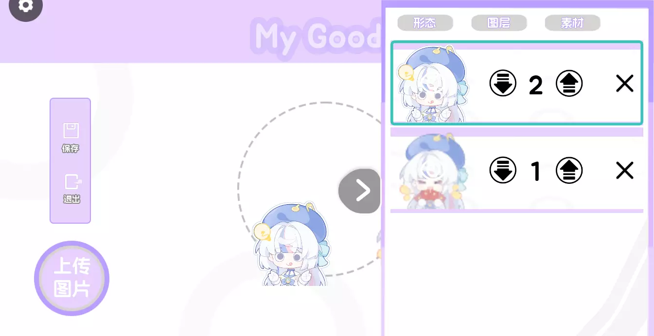 右边框框分为形态、图层、素材;就是字面意思=v=~(但是素材还很少呜呜呜呜!在努力了!)