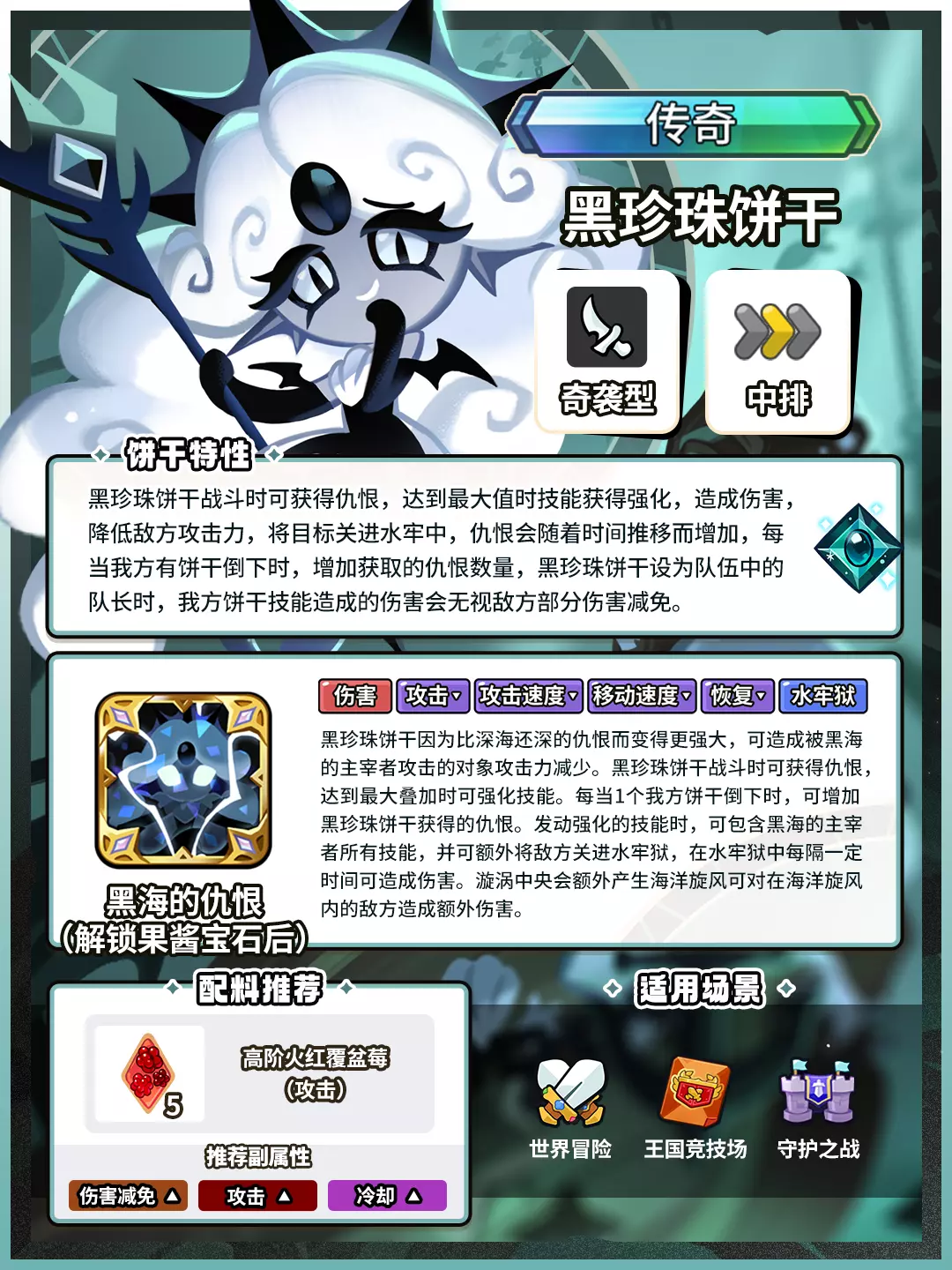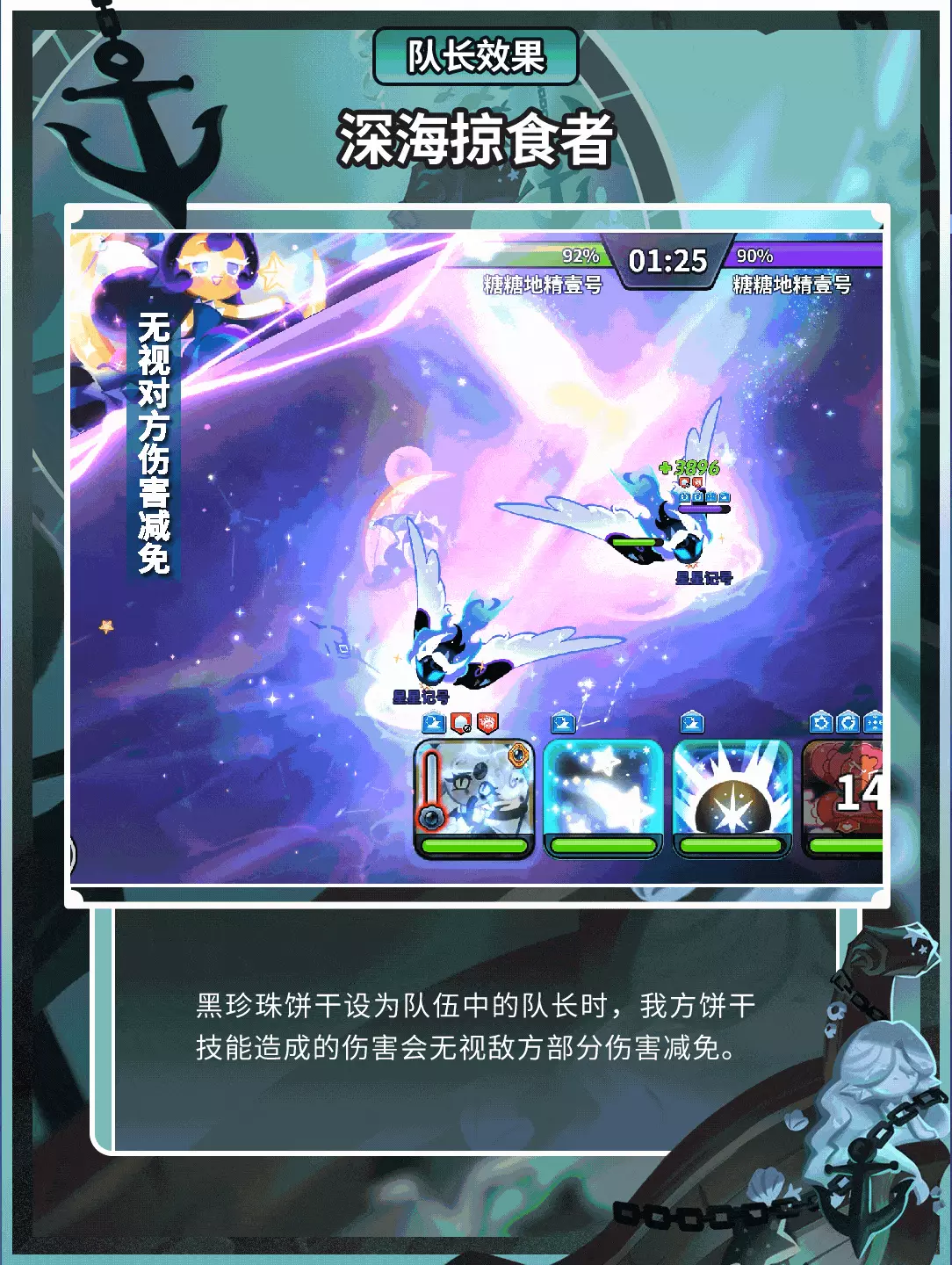 黑珍珠饼干设为队伍队长时,我方饼干技能伤害会无视敌方部分伤害减免。