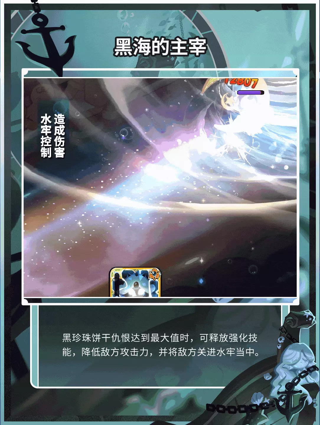 沉入海中掀起风暴,对命中敌人造成伤害,降低攻击力,并将敌人关进水牢狱中。