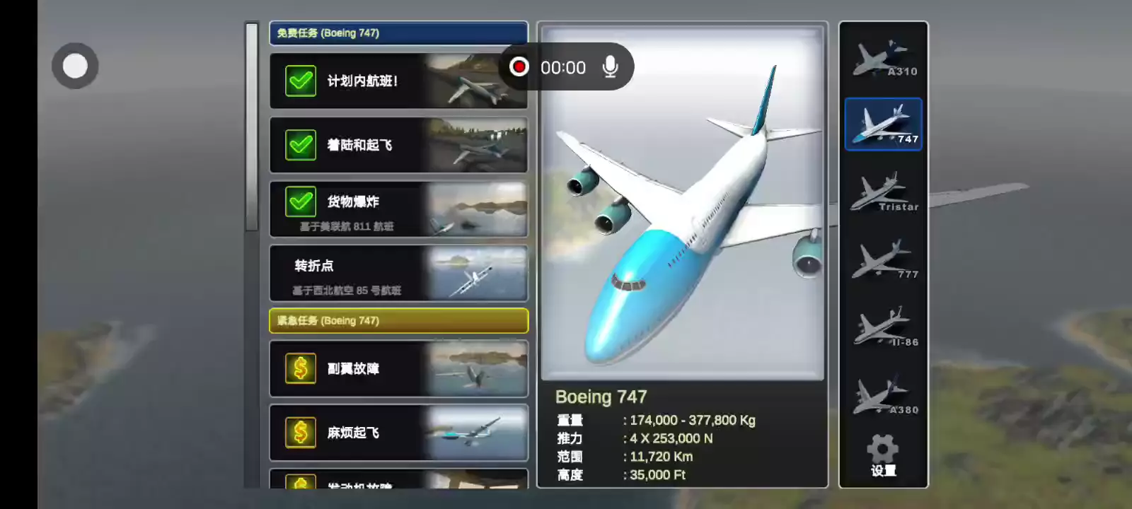 求救!求救!!求救!!!宣布紧急情况! 巨型喷气式飞机飞行模拟器是一个飞行模拟器游戏,由6种不同的巨型喷气式飞机组成,广泛用于商业航空。该游戏采用翼型物理设计,在移动设备上提供高度逼真的飞行模拟体验。 巨型喷气式飞机飞行模拟器还具有灾难任务的特点,这些任务基于现实生活中的空难,其中一个重大故障使飞机瘫痪。这是你展示非凡飞行技巧、驾驶飞机安全着陆或面对不可能的困难并战斗到底的机会。 该游戏还具有昼夜循环、动态天气、自由飞行模式和驾驶舱视图。与移动设备上的大多数飞行模拟游戏不同,Jumbo Jet飞行模拟器提供了控制系统、仪器和警告系统的全面列表。 控制系统: 副翼(侧倾控制) 电梯(俯仰控制) 方向舵(偏航控制) 襟翼 破坏者 修剪 反向推力 发动机上的不对称推力 自动驾驶仪 制动器 起落架 文书: 高度计 空速指示器 姿态指示器 标题 垂直速度指示器 转向指示器 打滑/打滑指示器 警报系统: 失速警告 倾斜角度警告 地形警告 起落架警报 主要注意 飞机: 空中客车A380 A380被昵称为超级巨型客机,是世界上最大的全长双层客机,可容纳525名乘客。空客A380有4个涡轮风扇发动机,可飞行14800公里。 波音747 波音747被称为最早的“巨型喷气式飞机”,是世界上第一架宽体客机。也被称为“天空女王”,超过1500架飞机在50年的时间里建成。 伊柳辛Il-86 伊柳辛Il-86被誉为“苏联第一架宽体飞机”,由伊柳辛设计局为苏联制造。在制造的100多架飞机中,只有3架仍在服役,全部由俄罗斯空军提供。 洛克希德L-1011三星 由洛克希德公司建造的“三星”于20世纪70年代投入生产,与波音747和麦克唐纳-道格拉斯DC-10竞争。总共建造了250架三星,只有一架仍在服役。 空中客车A310 空中客车A310通常被称为世界上第一架双喷气式宽体飞机,其航程足以在跨大西洋飞行中运行,空中客车A310于1983年首次投入生产。 波音777 它通常被称为“三七”,是第一架采用电传控制的波音飞机。777于1995年首次发射,现已超越747,成为波音公司生产量最大的宽体客机。 跳进驾驶舱,看看你是否具备成为大型喷气式飞机飞行员的条件!
