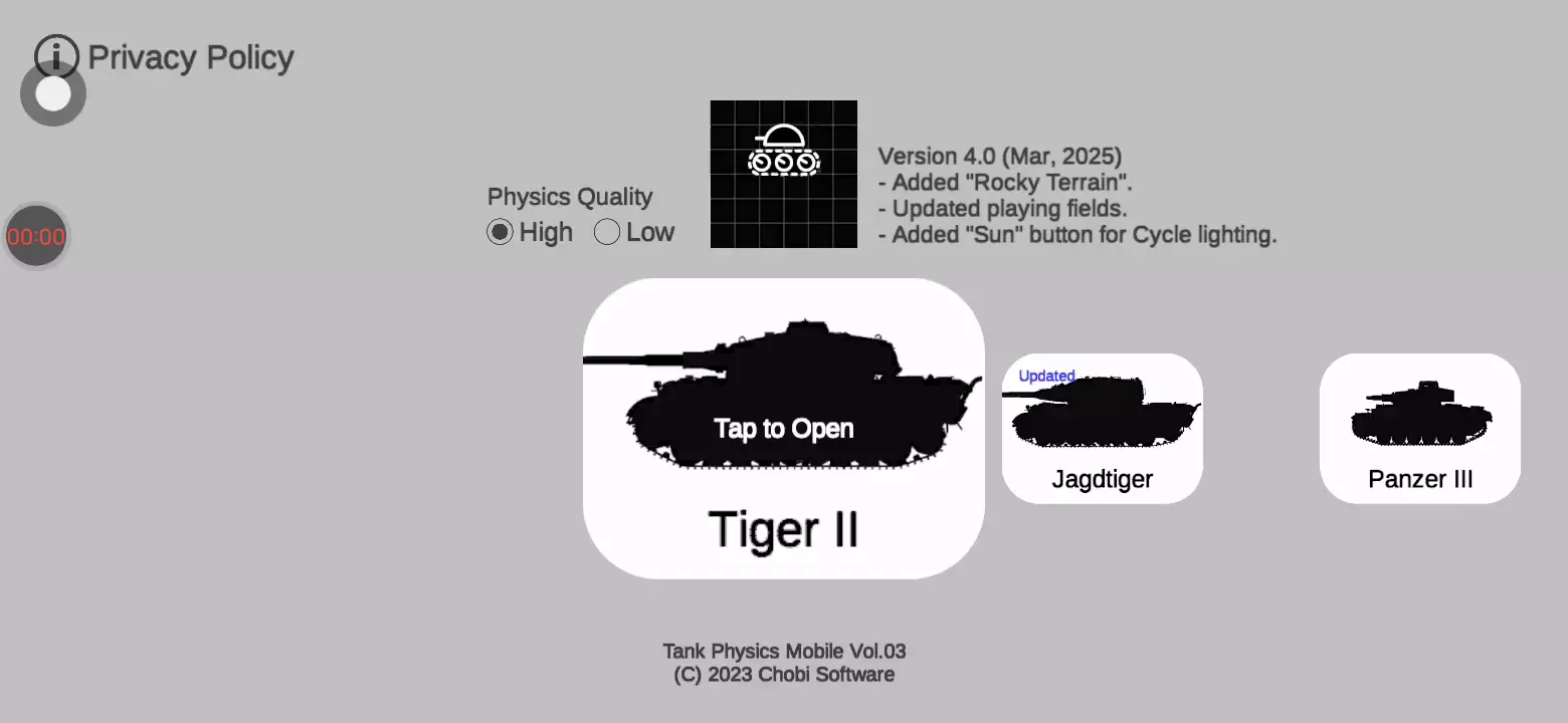 “Tank Physics Mobile”第 3 卷就在这里! (注意。) - 这不是战斗游戏。请欣赏坦克的逼真运动。 - 系统要求 >> Snapdragon 720 或更高版本。 [可操作坦克] 老虎 2 美洲虎 装甲 3 StuG 3 (更多坦克将在未来更新中添加)