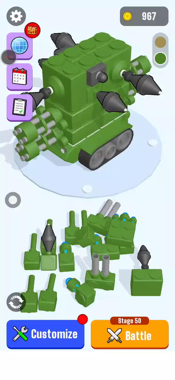 随意将大炮连接到您的坦克并击落敌人! 您可以建造一座装满大炮的塔,也可以在其上放置大量尖刺进行混战! 像塔一样完成你的坦克!
