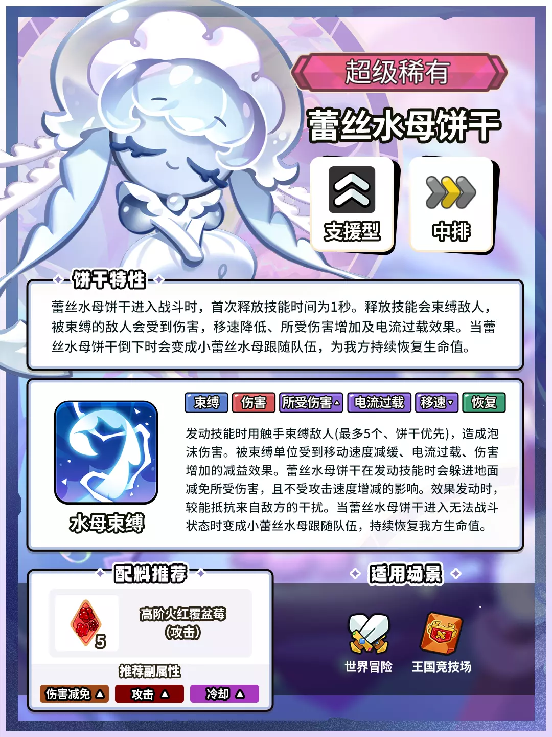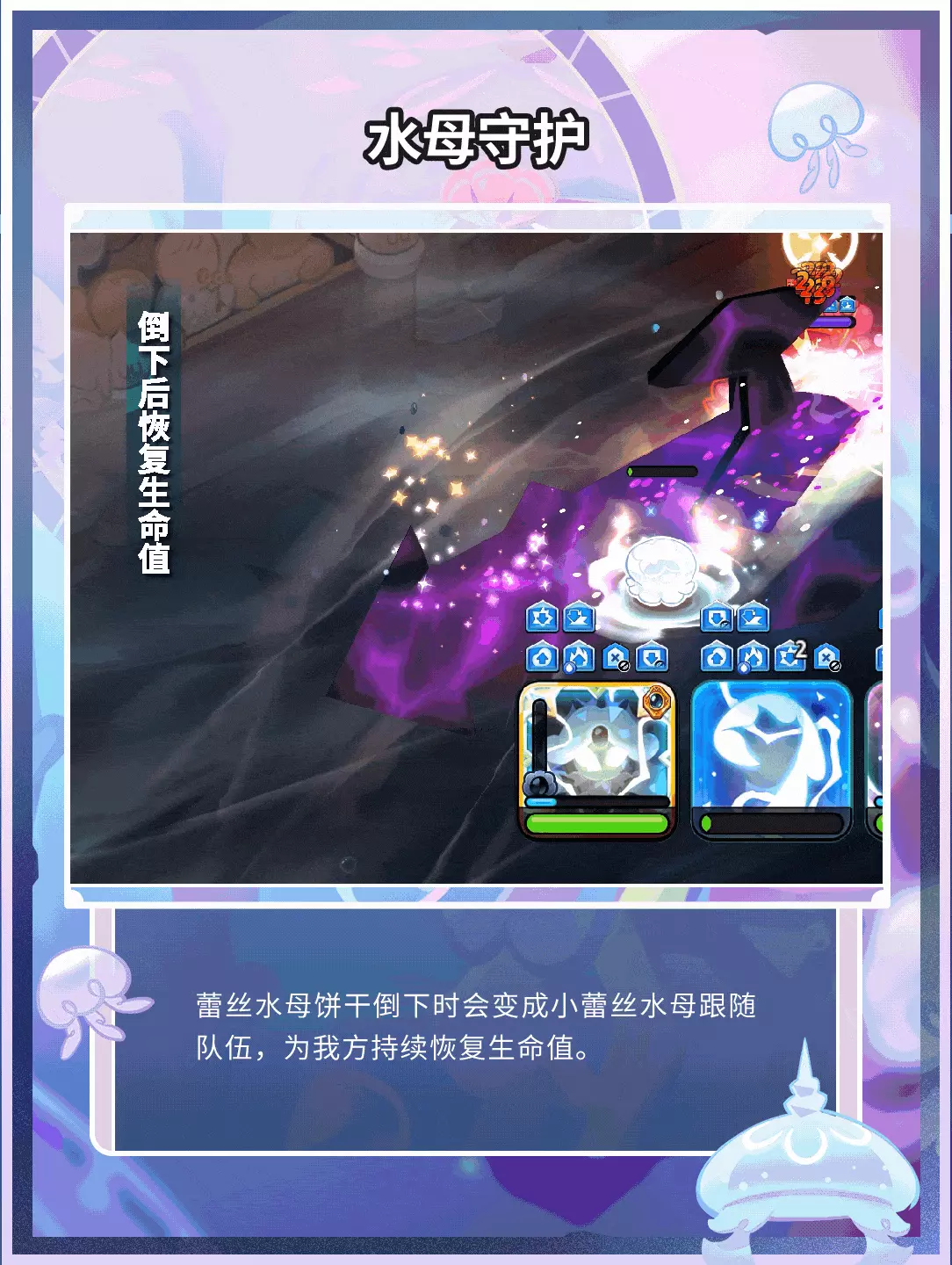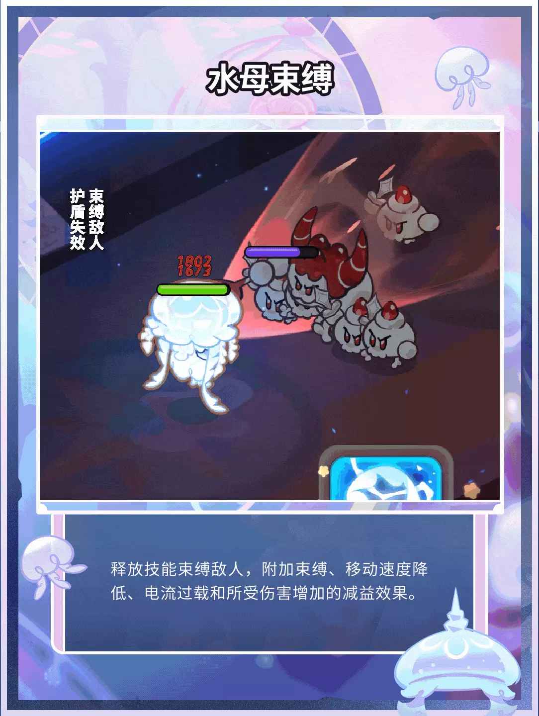 释放技能并躲进地下,同时束缚敌人,被束缚的敌人会受到伤害,移速降低、所受伤害增加及电流过载效果。当蕾丝水母饼干倒下时会变成小蕾丝水母跟随队伍,为我方持续恢复生命值。