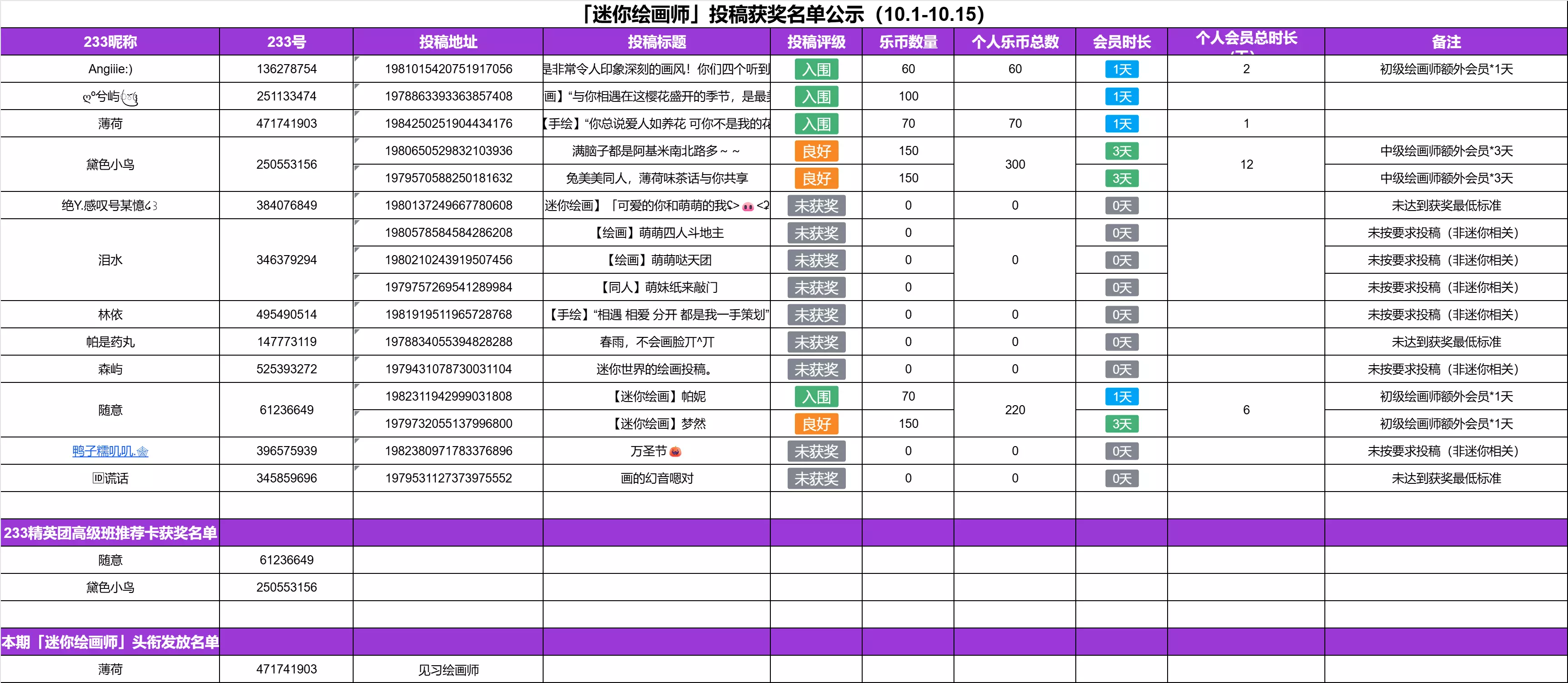 「迷你绘画师」投稿获奖名单公示(10月1日-10月15日)