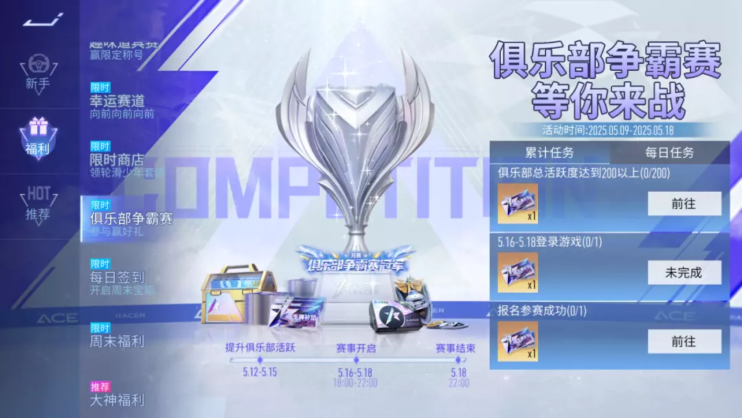 号外!号外~俱乐部对抗赛全新升级→俱乐部争霸赛,将于5月16日正式开启!5月9日,参与活动得王牌补给券等好礼。