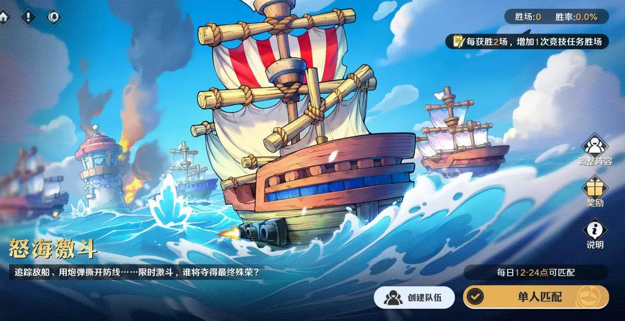 >>活动内容:怒海激斗是战斗属性平衡的3V3公平竞技玩法;各位船长可操控1艘战船并携带1个船技进行战斗,在规定时间内优先击破10艘船的队伍获得胜利;完成活动任务,可获得奖励。