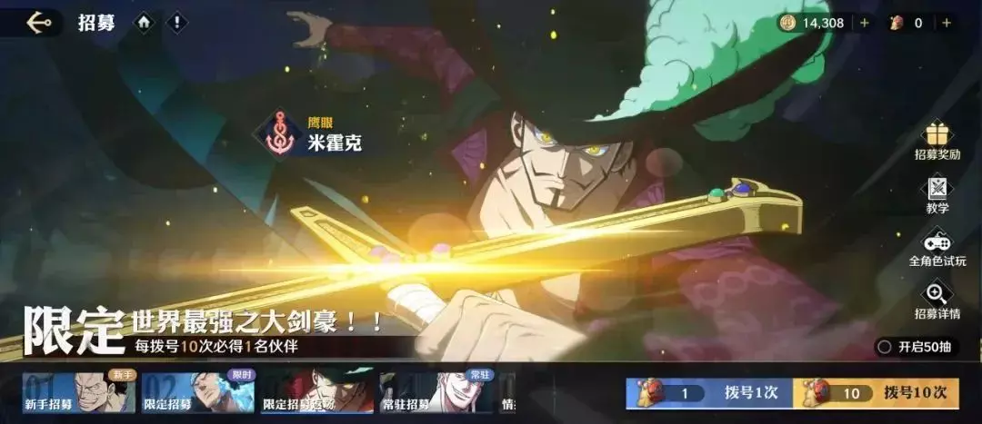 活动期间,船长在限定招募中拨号50次和70次可获得米霍克体验卡,招募到伙伴米霍克可额外领取「米霍克」碎片(已经领取过的无法领取)。