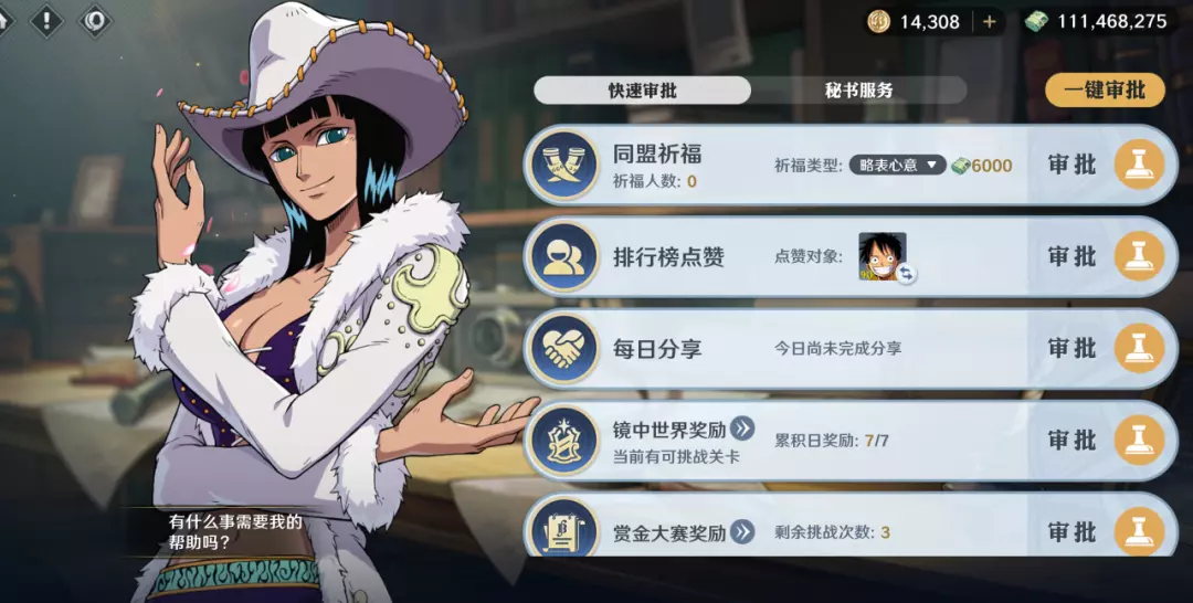 >>活动内容:活动期间,专属秘书为船长提供快速审批和秘书服务,船长可在快速审批界面中完成各种日常事务,船长通过秘书服务每日可获得小队冒险秘书卡、秘宝试炼秘书卡,助力快速完成对应玩法,同时每在竞技场胜利1场可增加3场周任务胜利场次。