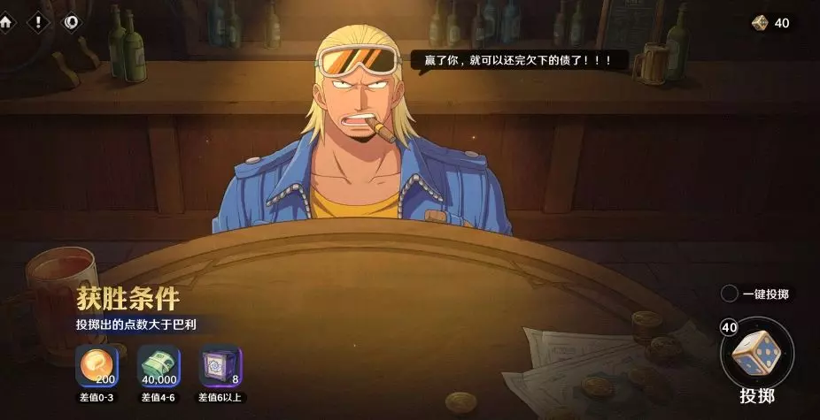 >>活动内容:领取每日任务宝箱奖励或消耗体力可获得骰子;与巴利展开骰子对决,每次双方将会投出两个骰子,骰子点数之和更大的一方获胜;根据不同的点数差值,船长可获得不同的奖励。