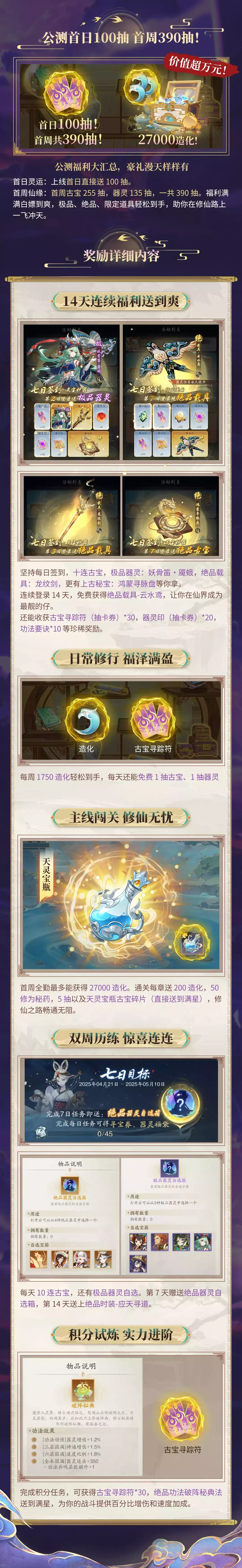 首周仙缘:首周古宝 255 抽,器灵 135 抽,一共 390 抽。福利满满白嫖到爽,极品、绝品、限定道具轻松到手,助你在修仙路上一飞冲天 。