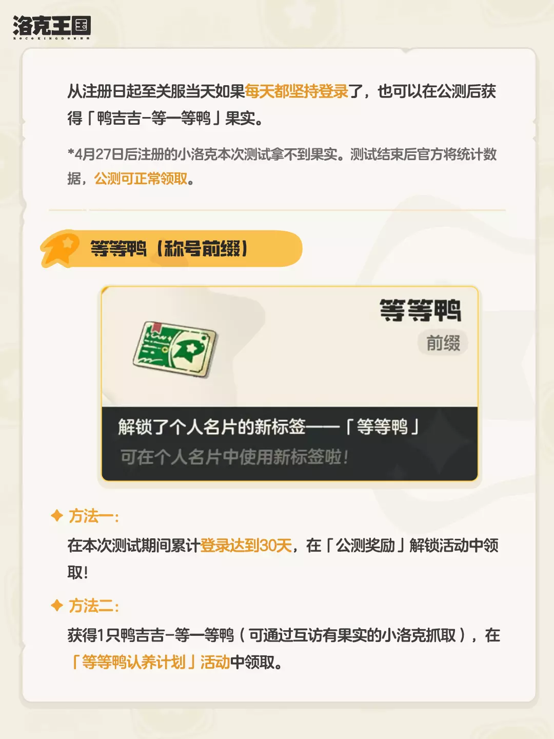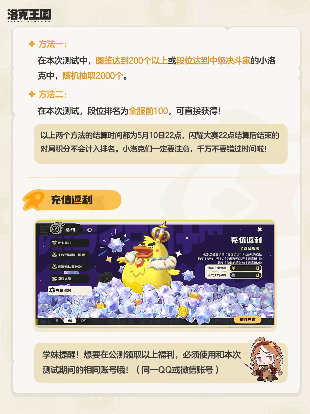 5月10日「等等鸭测试」关测在即,昨天的推文发出后,相信部分小洛克对如何薅福利、公测奖励怎么领等问题依然有不少的疑问!