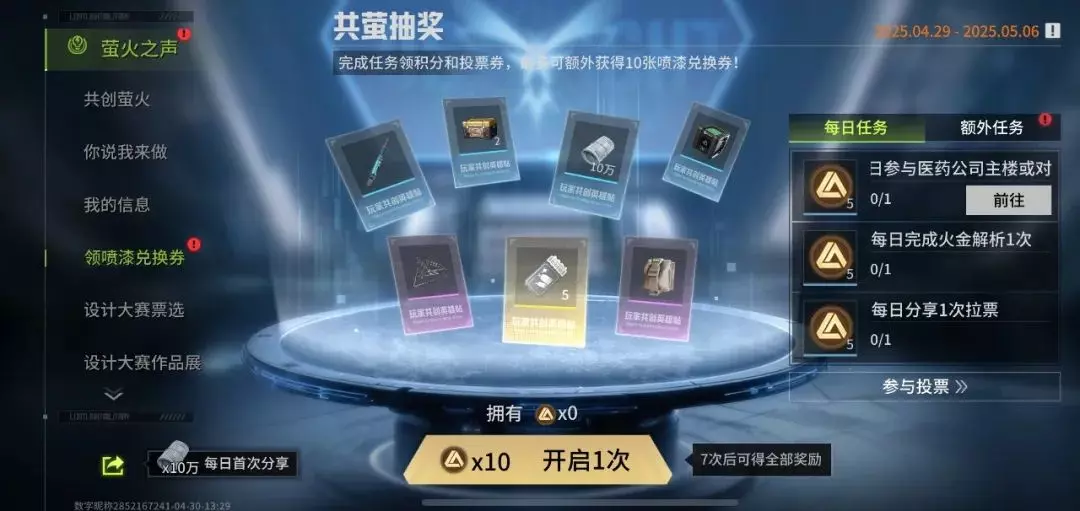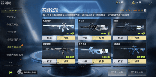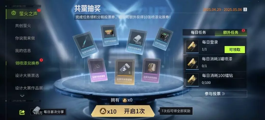 现在登陆游戏,找到【活动】-【萤火之声】-【领喷漆兑换券】/【设计大赛票选】,完成额外任务获取投票券,将你心仪的喷漆送上榜一