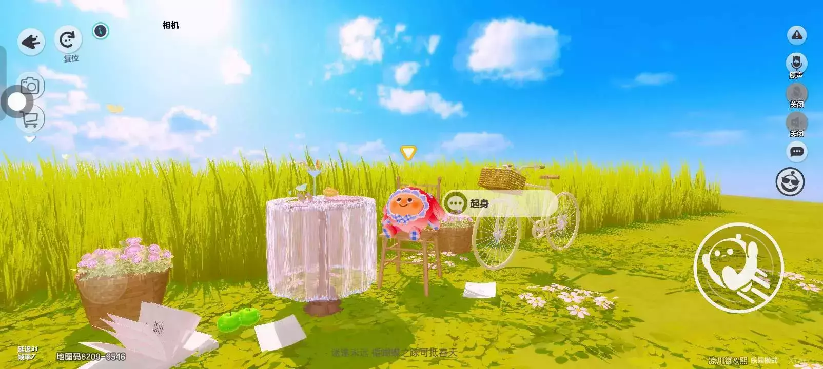 第4个打卡点这是一幅充满春日氛围的游戏场景画面 湛蓝天空中飘浮着白云 阳光明媚 翠绿草地上布置着惬意的野餐元素 铺有轻薄纱帘的圆桌 上面摆放着饮品等 一旁木椅上坐着可爱的蛋仔还有装满粉色花朵的大花篮 带篮子的自行车 散落的书本 青苹果与小花点缀其间 整体营造出悠闲 美好的户外野餐氛围⸝⸝>ಲ<⸝⸝
