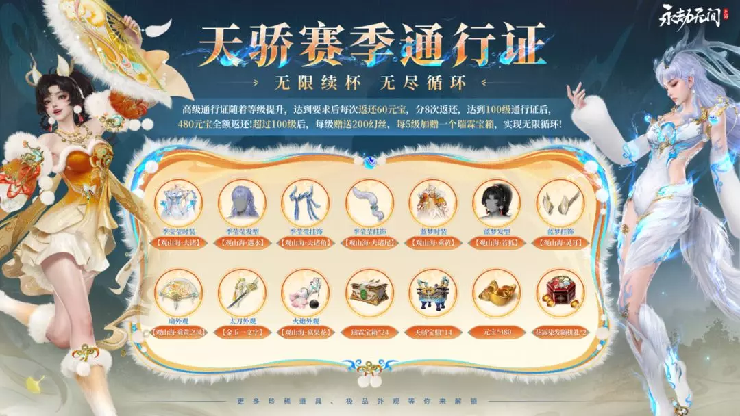 超过100级后,每级赠送200幻丝,每5级加赠一个瑞霖宝箱!每个赛季还能享受价值超24000元宝的道具,聚窟洲性价比天花板,千万别错过!
