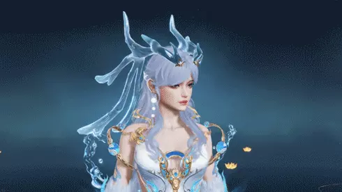 淡紫色披肩长发柔顺飘逸,似被山间灵风轻拂。头饰以透明材质打造,呈夫诸角状,线条流畅,其上点缀金饰与蓝宝,清冷闪耀。